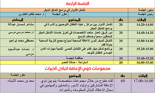 وصرح الدكتور عبدالله الصبي رئيس اللجنة العلمية للملتقى أن الملتقى سيتضمن استعراض ومناقشة للخبرات البارزة التي أسهمت في نجاح برامج التدخل المبكر للأشخاص ذوي الإعاقة في دول مجلس التعاون الخليجي، من خلال العديد من المحاضرات وورش العمل المتخصصة، التي سوف يقدمها العديد من المختصين في دول الخليج العربي.