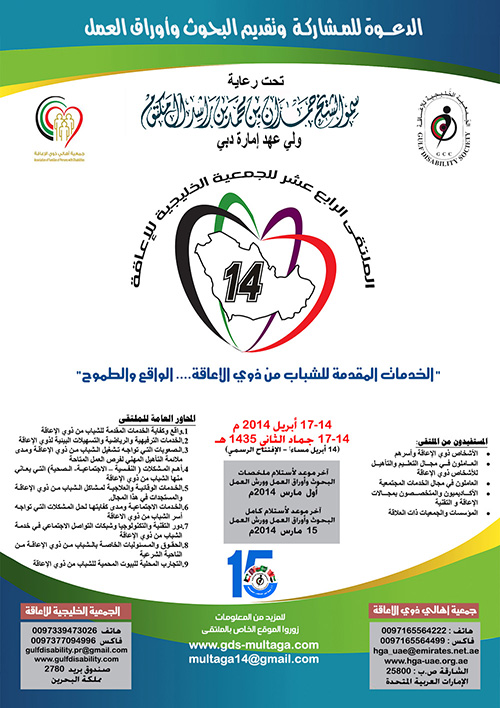 يسر اللجنة المنظمة دعوتكم للمشاركة وحضور فعاليات " الملتقى الرابع عشر للجمعية الخليجية للإعاقة" تحت شعار "الخدمات المقدمة للشباب من ذوي الإعاقة.... الواقع والطموح"، خلال الفترة من 14-17 أبريل 2014م الموافق 14-17 جمادى الثاني 1435هـ في مدينة دبي – الإمارات العربية المتحدة، والذي سيقام بالتعاون بين الجمعية الخليجية للإعاقة وجمعية أهالي ذوي الإعاقة بدولة الإمارات العربية المتحدة.